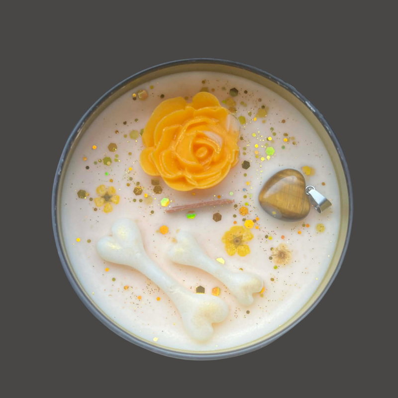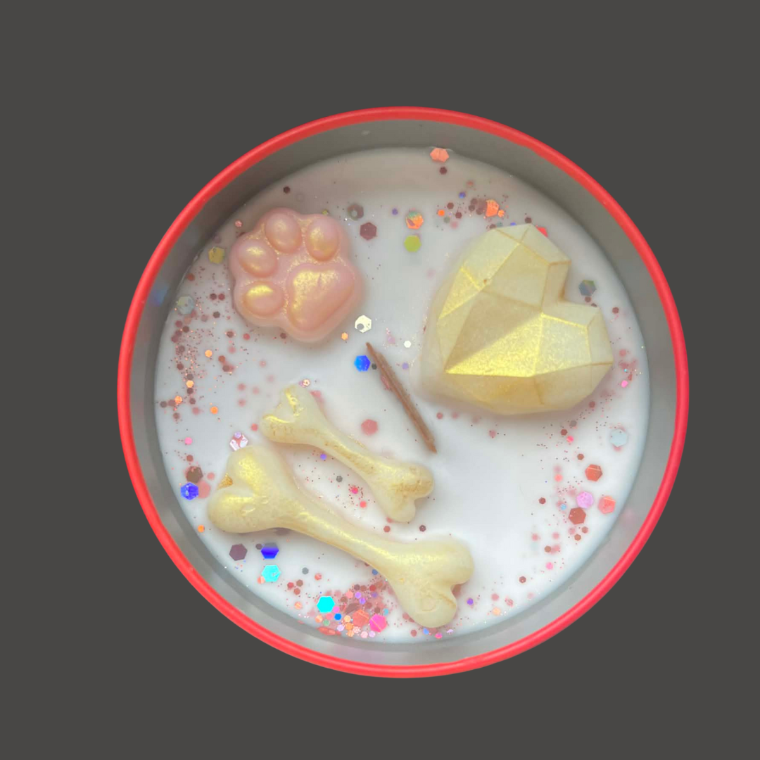 Pour la bougie de 150 g, vous trouverez des os et des coussinets en cire, un hommage ludique et doux à nos animaux de compagnie bien-aimés.