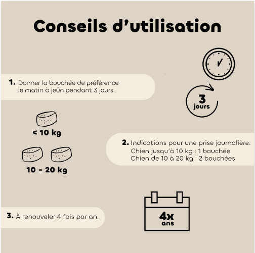 Administrez de préférence le matin à jeun et mélangez les bouchées avec un peu de pâtée plutôt qu’avec des croquettes pour une absorption optimale.