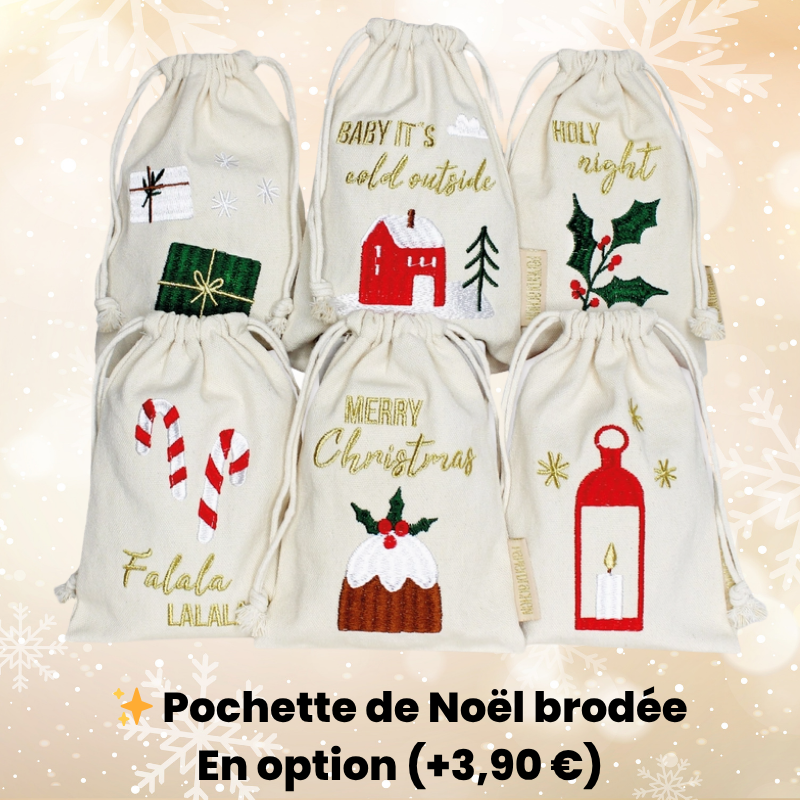 Offrez une touche magique à vos achats de Noël ✨ : Ajoutez une pochette de Noël brodée pour présenter vos friandises, coffrets ou accessoires. Vous trouverez dans la galerie photos du produit des sacs-cadeaux de Noël en coton brodé, idéaux pour emballer vos présents.