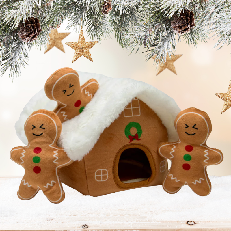 Offrez Ă votre chien une touche de féérie avec La Maison Pain dâĂpices, un jouet de NoĂ«l moelleux et interactif qui cache trois petits bonshommes en pain dâĂ©pices Ă dĂ©nicher et secouer !