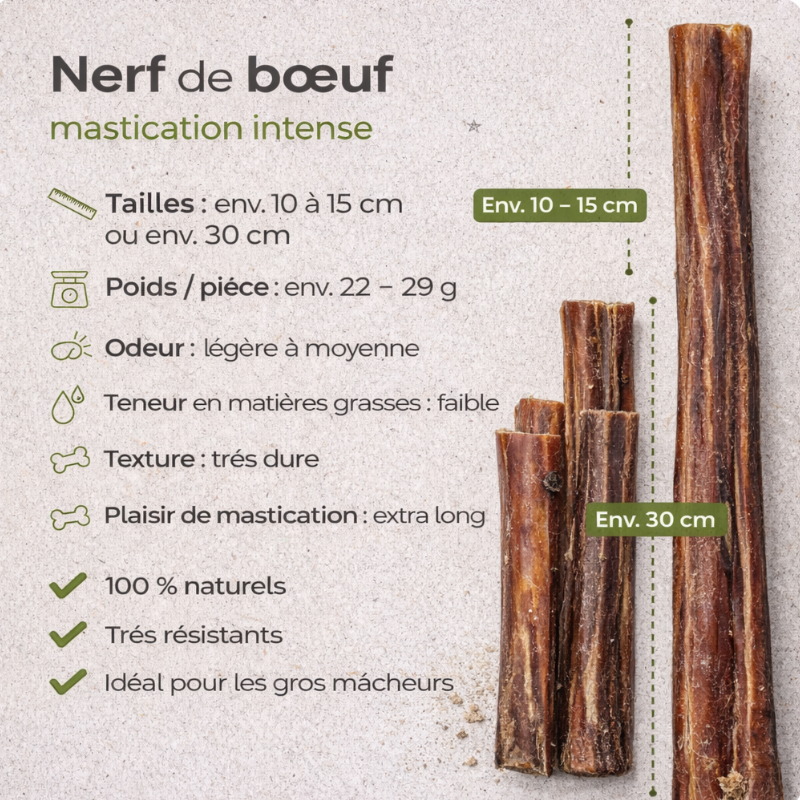 • 100% nerf de bœuf, sans grains, produits chimiques, conservateurs ni autres additifs.