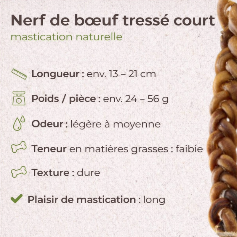 Le nerf de bœuf tressé court est une friandise naturelle à mâcher, particulièrement pauvre en matières grasses. Il est composé à 100 % de bœuf séché, sans conservateurs ni additifs artificiels.